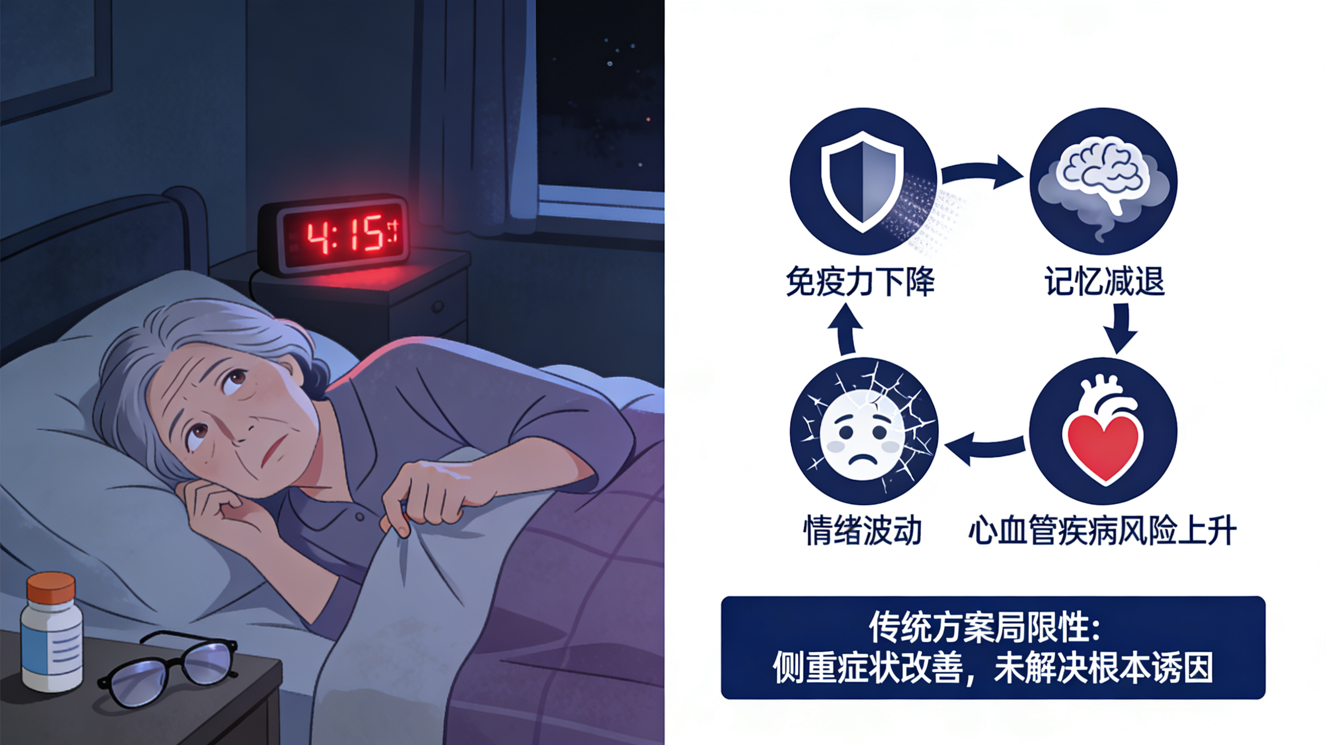 失眠不仅是夜间困扰。研究证实,长期睡眠障碍将导致免疫力下降、记忆力减退、情绪波动及心血管疾病风险上升,形成健康恶性循环。传统方案在解决根本性、个性化的睡眠障碍上,显得力不从心。