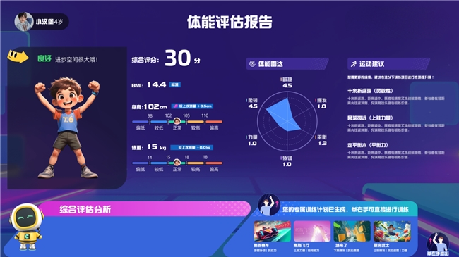 传统、枯燥的体能测试,被搬进了客厅,变成孩子主动参与的体感闯关游戏。通过 AI 视觉识别与 AR 体感交互,国家标准六项体能测试化为“孩子抢着玩的运动关卡”,在家即可完成科学测评 + 趣味训练的完整闭环。
