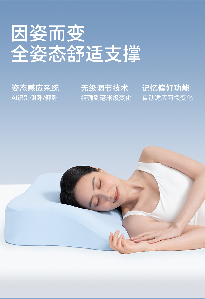 传统记忆枕的“慢回弹”在深夜翻身时常常变成一种阻碍。伊枕入梦的“0压漂浮”系统,则模拟了被温柔手掌托举的体验。它并非被动地适应,而是通过智能感应,在您翻身时动态调整颈后气囊,无论仰卧侧卧,颈椎始终处于最放松的生理曲度。对于长期伏案、颈椎曲度变直的职场人来说,这种一整夜不间断的矫正与支撑,无疑是清晨醒来时肩颈轻松的关键。