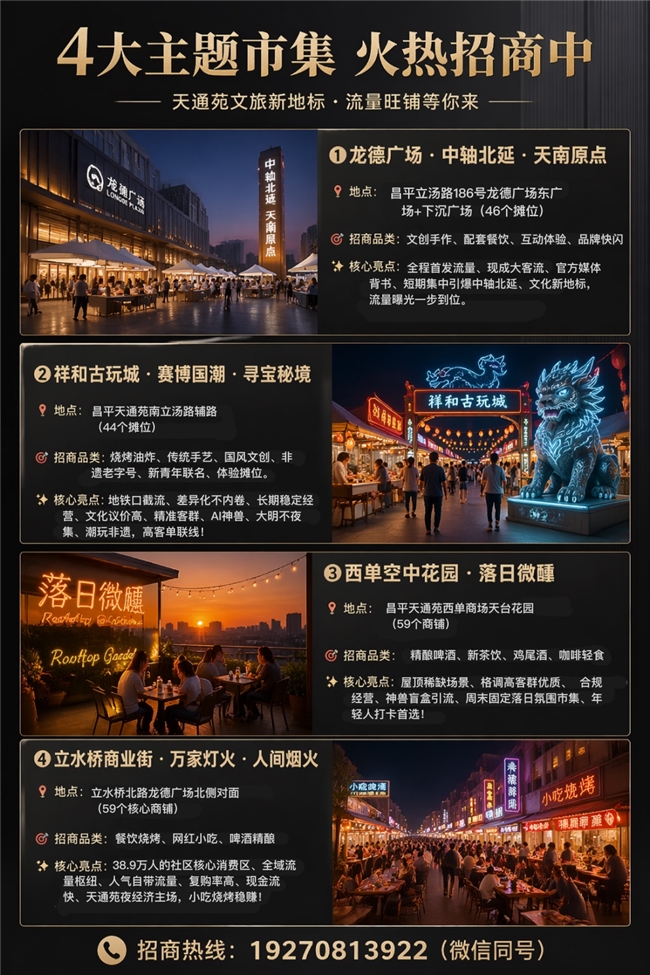 祥和古玩城“大明不夜·潮玩非遗”市集自2026年5月起长期稳定运营,营业时间为工作日19:00–21:00,周末及法定节假日14:00–21:00。目前,市集首期44席黄金铺位启动全城招商,核心区位先到先得,额满即止。欢迎各类有特色、有内容、有品质的品牌及手工艺人与潮流主理人加入,共同点亮中轴线北延的明珠,助力夜经济消费提质升级。